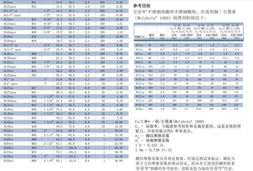 不銹鋼墊圈(EN 1.4404 / AISI 316L),DL3SS—DL42SS(標準尺寸)和DL45SS—DL80SS(根據要求定制)。
